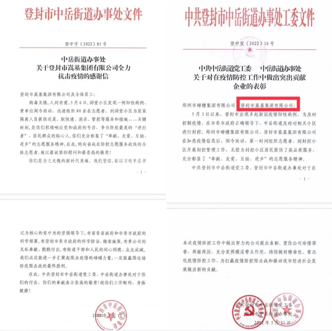 5月11日,中共登封市中岳街道辦事處下發(fā)《關(guān)于對在疫情防控工作中做出突出貢獻(xiàn)企業(yè)的表彰》,對嵩基集團第一時間組織志愿者到封控小區(qū)開展封控管理工作表示衷心的感謝。